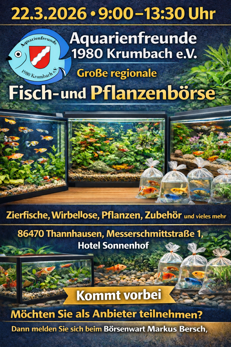 12.04.2026 9 - 11:30 Uhr Vereinsbörse, Fisch- und Pflanzenbörse, Zierfische, Garnelen, Pflanzen, Zubehör und vieles mehr.